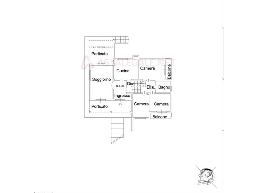 soggiorno, cucina, tre camere, bagno, disimpegni e due balconi al piano primo.