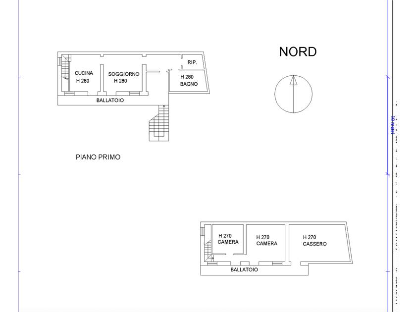 appartamento al primo piano con ingresso sul lato sud da scala esterna e ballatoio: composto da: ingresso, soggiorno, cucina, ripostiglio e bagno, mediante scala interna posta in cucina, si accede al secondo piano ove si trovano due locali ed un cassero accessibile dal ballatoio;